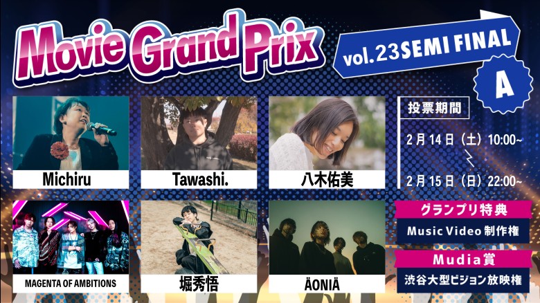 ライブ動画またはMVでのナンバー1決定戦。見事グランプリに輝くとMusic Video 制作権をゲット!! 審査員優秀賞は渋谷大型ビジョン放映権も!! ムービーグランプリを通してより多くの人に『貴方の音楽』を発信したい方を応援します。 ✅投票方法・勝ち抜きルールはこちらをチェック https://mudia.tv/vote_method/movie_grand_prix_vol23