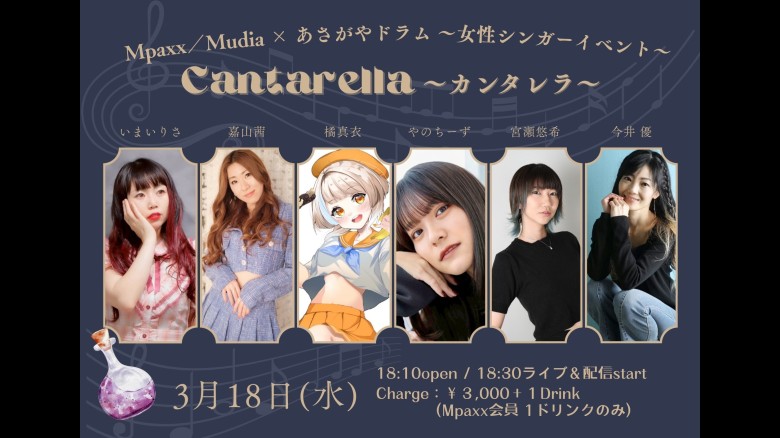 「Mpaxx/Mudia×あさがやドラム『女性シンガーイベント Cantarella~カンタレラ~』」に出演する6名の歌姫たち。とても楽しみにしています。頑張ってください。