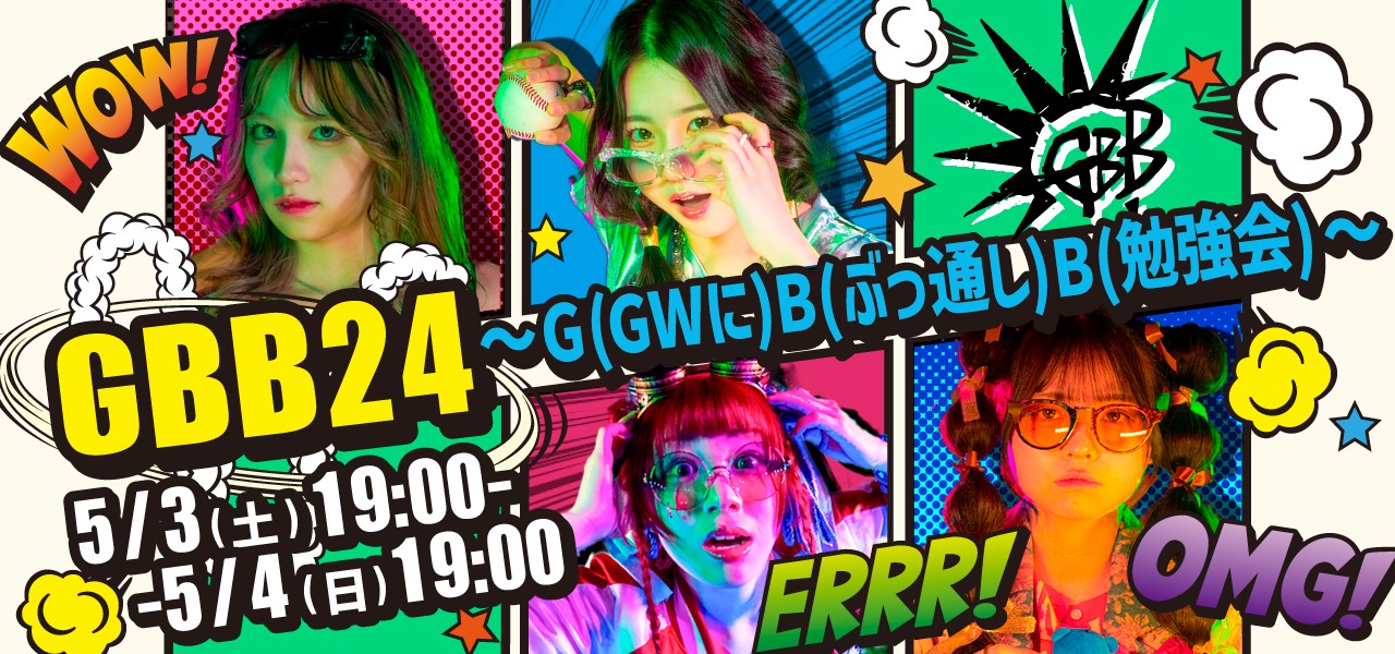 Girls be badによる24時間連続のリアルイベント「GBB24(ジービービー24)」は、ライブ・チェキ・ゲームを90分1ブロックとし、全16ブロックを通して、メンバー同士の競争とファン参加型の盛り上がりを掛け合わせて行うイベントです。 ゲームの成績に加え、Mudia上での応援ポイントが勝敗に影響し、全16ブロック終了後に優勝者が決定!