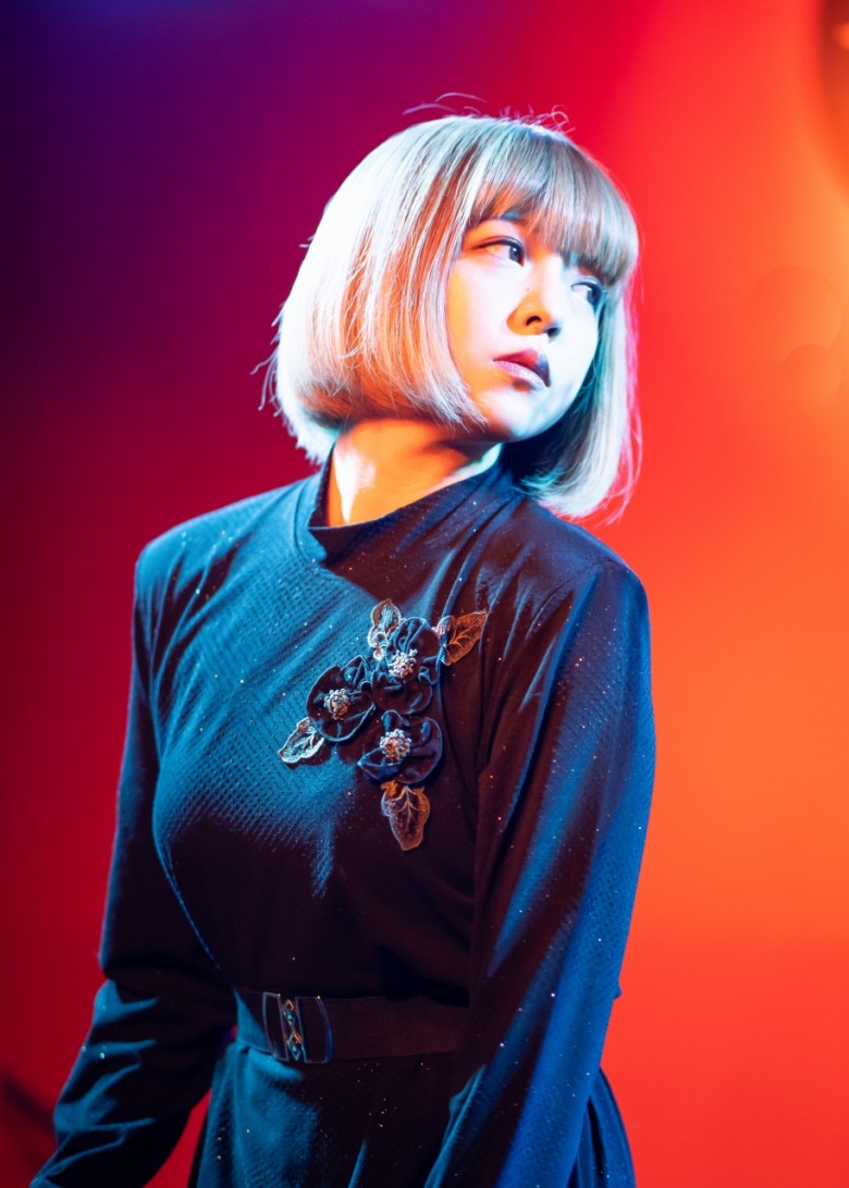 久保田れなさんのライブを観た時、一つ一つの立ち振る舞いがとても美しい方だという印象を持ちました。衣装は背景のオレンジ色を意識して、映えるものを選んできたとのこと。