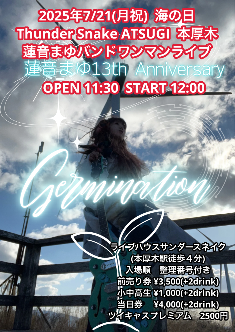 蓮音まゆバンドワンマン2025年7/21(月祝) 海の日 Thunder Snake ATSUGI 本厚木 13th Anniversary 【Germination】 OPEN 11:30 START 12:00