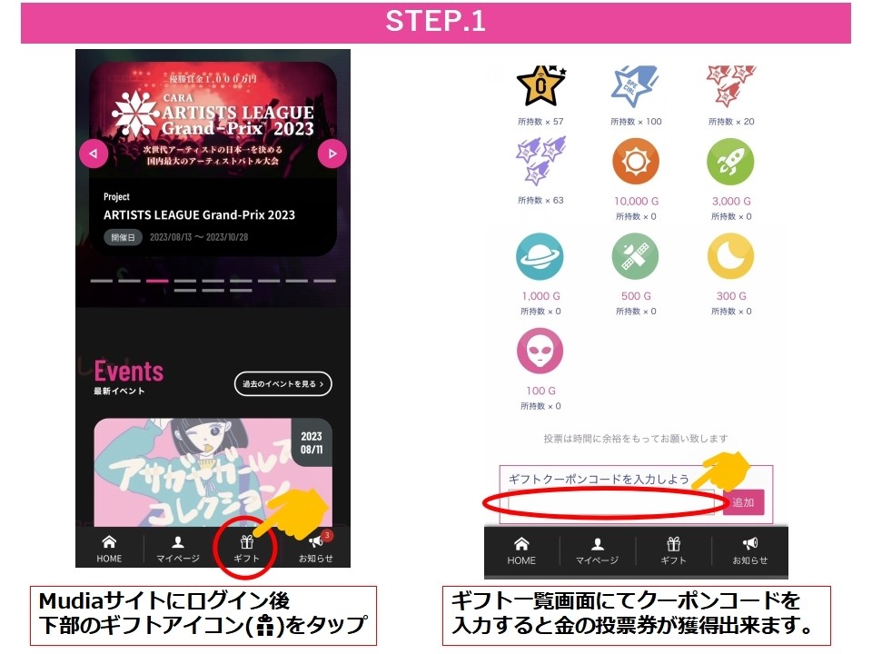 SNS等で発表されるキャンペーン限定で配布されるクーポンコード、もしくは会場にて配られたクーポンコードをMudiaサイトに入力すると投票ギフト「金の投票券」が得られます。※キャンペーンによっては他の無料ギフトの場合もあります。