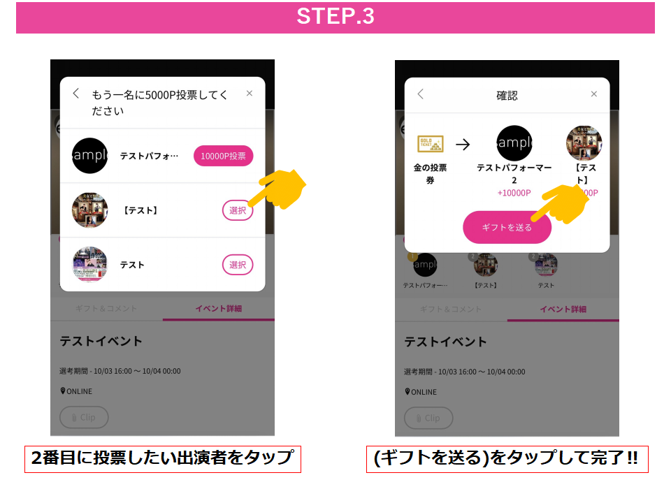 1.投票時間中(実際のライブが開催されている時間(START~最後のアーティストの演奏終了時間)に生配信されますので、応援したいアーティスト(10,000pt投票)を選んでタップor クリック