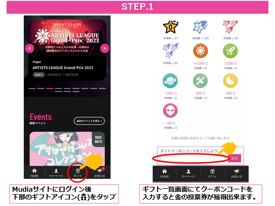 その投票券に記載されているクーポンコードをMudiaサイトに入力すると投票ギフト「金の投票券」が得られます。